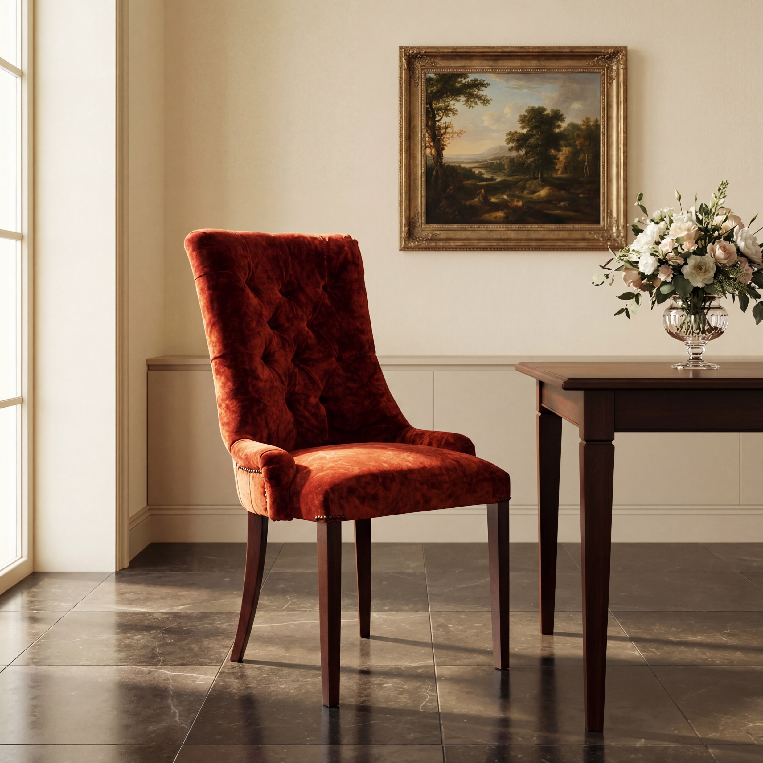 Νεοκλασσική καρέκλα, που εξασφαλίζει την άνεση πολυθρόνας, με χειροποίητο καπιτονέ σε όλο το μήκος της πλάτης.