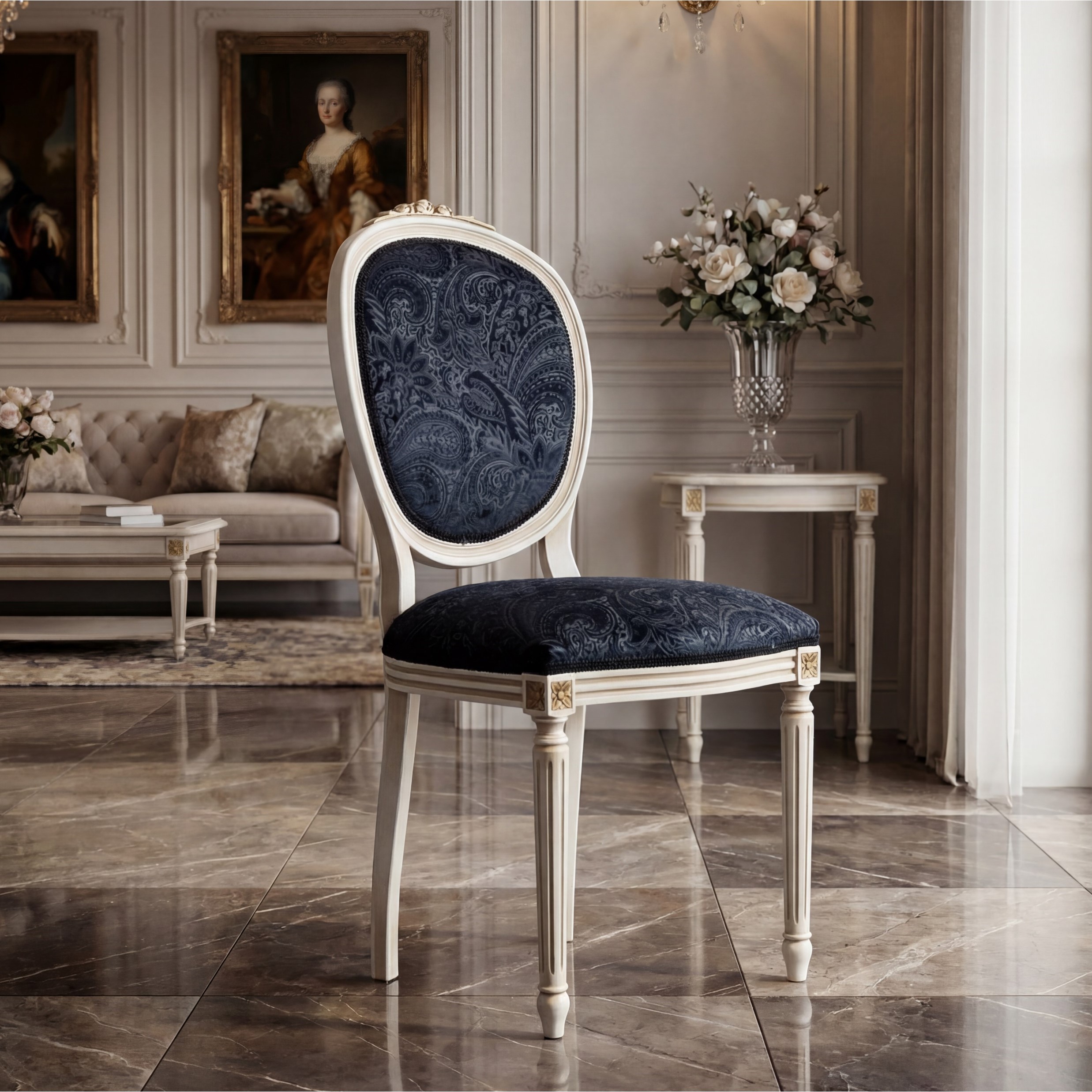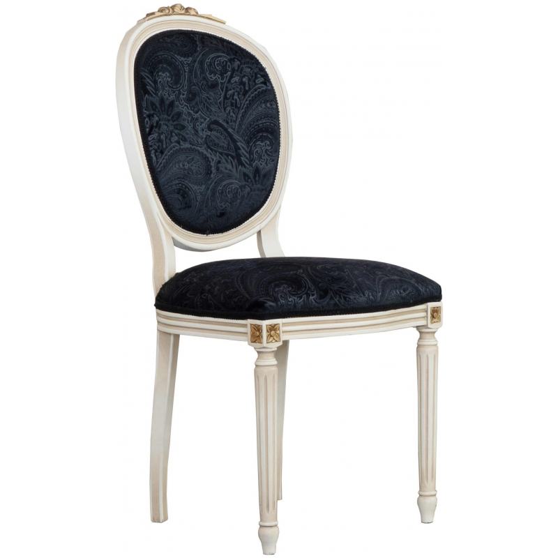 Κλασσική καρέκλα τραπεζαρίας, με χειροποίητο σκάλισμα “τριαντάφυλλο” στον νωμίτη.