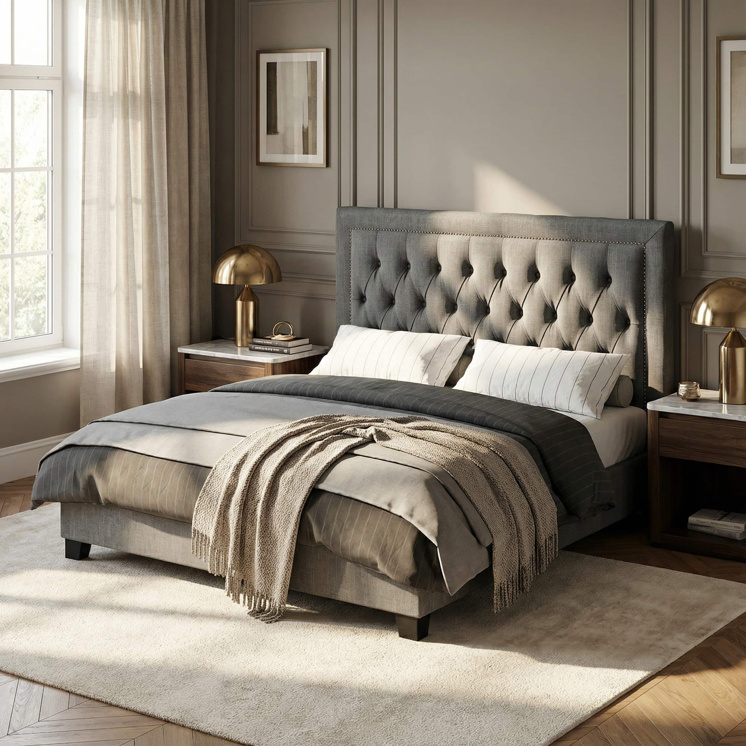 Λιτό και ταυτόχρονα ενυπωσικαό ντυμένο κρεβάτι σε λιτές γραμμές, με χειροποίητο καπιτονέ στο κεφαλάρι. Μπορεί να κατασκευαστεί κατόπιν παραγγελίας, σε οποιαδήποτε διάσταση ή χρώμα.